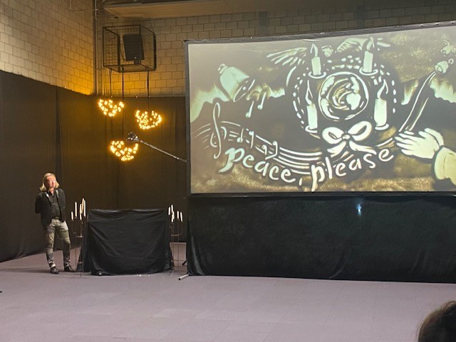 Tijdens het vertellen van het kerstverhaal van Jozef en Maria, bracht hij met handen en vingers alles in beeld.