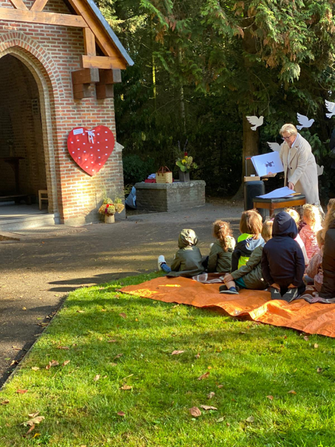 m.m.v. pastoraal werkster Pauline Vermeulen. Te voet onder stralende weersomstandigheden met de kinderen, leerkrachten, enkele ouders en enkele leden van de werkgroep naar de Bernarduskapel